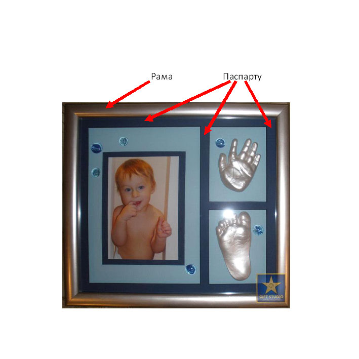 Классическая багетная рама для оформления слепков 2D ручек и ножек ребенка и фото ребенка.